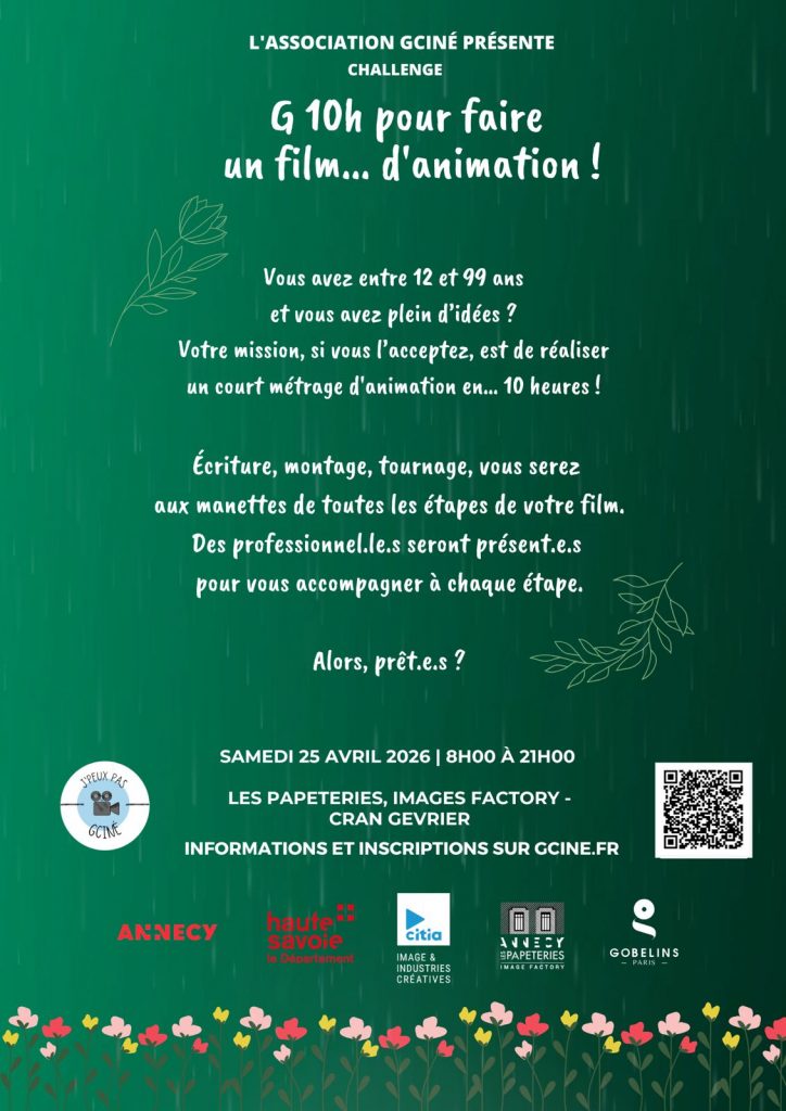 Gciné vous propose la quatrième édition des G10h, notre événement phare, consacrée au cinéma d’animation. Comme les années précédentes, nous vous invitons à réaliser en 10h, seul.e ou en équipe, un film d’animation d’environ 1 min. Pâte à modeler ? Papier découpé ? Ou même pixilation ? Choisissez votre technique, et sur le thème qui sera révélé le matin même, laissez votre créativité s’exprimer. Des étudiant.es des Gobelins seront présent.es pour vous encadrer et vous conseiller.